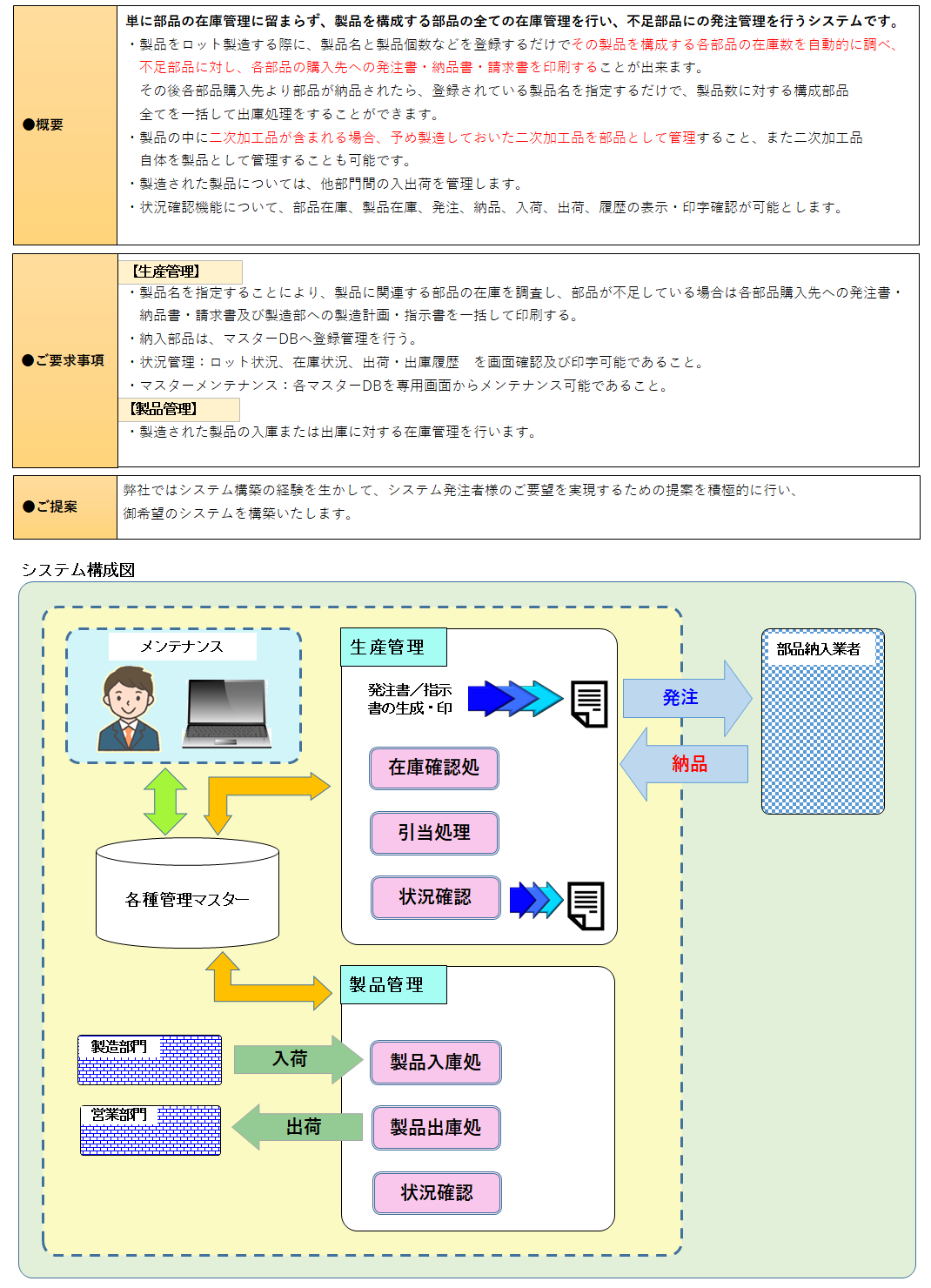 - 製品のロット製造時の構成部品の在庫管理・購買管理を行います。